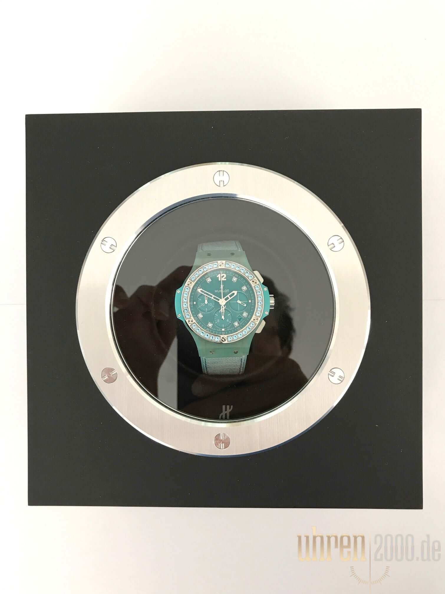 Gehäusedurchmesser 41 mm, Gehäusehöhe 14,50 mm, Lünette aus poliertem Edelstahl mit 36 blauen Topas, grünes Kautschukband mit Faltschließe, grünes Zifferblatt aufgesetzten Topas, Automatikwerk, Manufakturkaliber HUB4300, Schwingung 28.800 A/h, Gangreserve für ca. 42 Stunden, Chronograph, Datum, Saphirglas entspiegelt, Saphirglasboden verschraubt, Wasserdicht bis 10 bar.