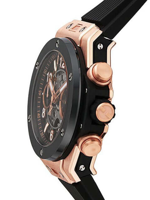Gehäuse aus satiniertem King Gold, Gehäusedurchmesser 42 mm, Lünette aus Keramik, transparentes Zifferblatt mit Leuchtindizes und Leuchtziffern, schwarzes Kautschukband mit Faltschließe, Automatikwerk, Manufakturkaliber UNICO HUB1280, Schwingung 28.800 A/h, Gangreserve für ca. 72 Stunden, Chronograph, Datumsanzeige, Saphirglas entspiegelt, Saphirglasboden verschraubt, Wasserdicht bis 10 bar.
