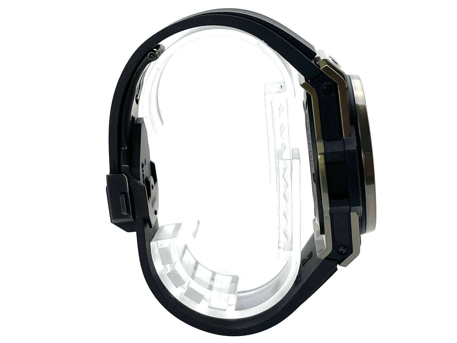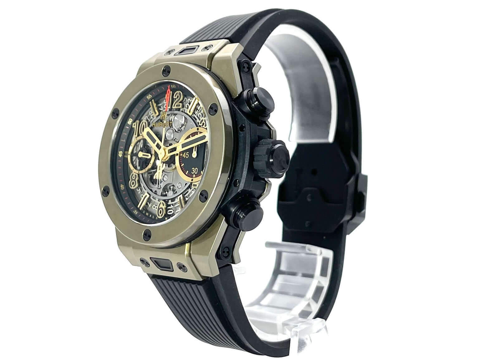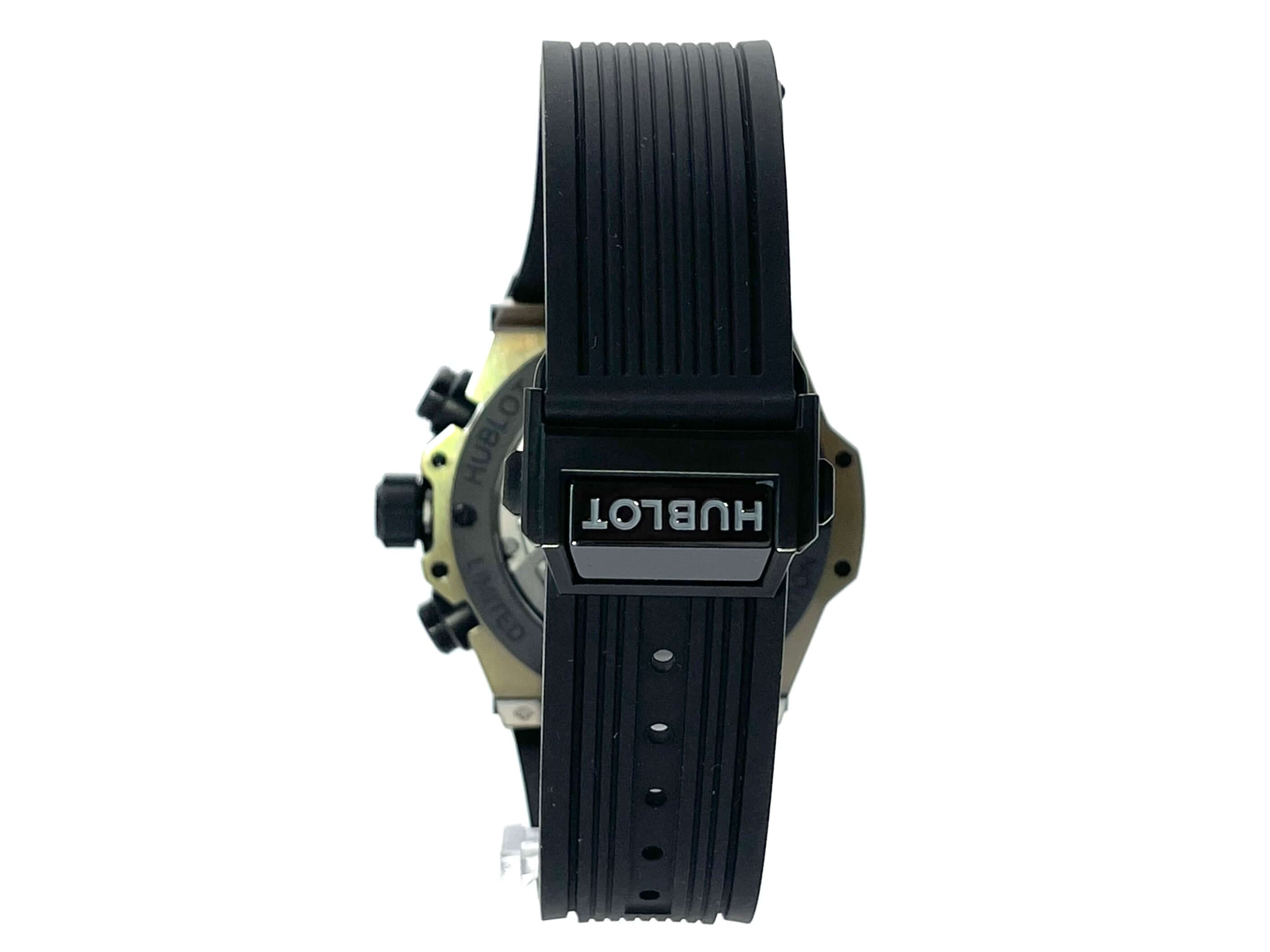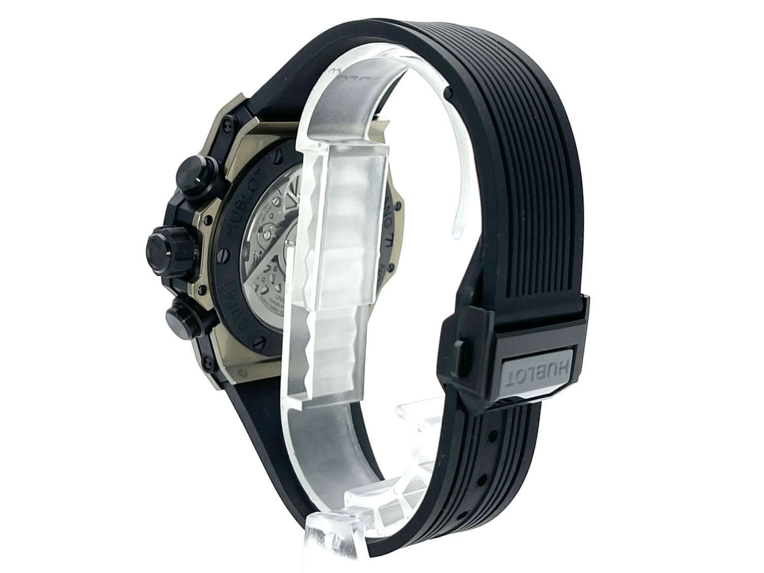 Gehäuse aus satiniertem Magic Gold, Gehäusedurchmesser 42 mm, Lünette aus satiniertem Magic Gold, transparentes Zifferblatt, schwarzes Kautschukband mit Faltschließe, Automatikwerk, Manufakturkaliber UNICO HUB1280, Chronograph, Schwingung 28.800 A/h, Gangreserve für ca. 72 Stunden, Datumsanzeige, Saphirglas entspiegelt, Saphirglasboden verschraubt, Wasserdicht bis 10 bar.