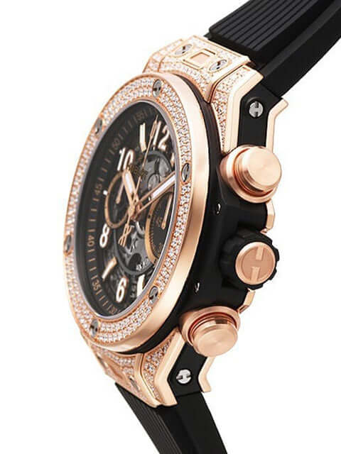 Gehäuse aus King Gold mit 162 Diamanten 1,1ct besetzt, Gehäusedurchmesser 44 mm, Lünette aus King Gold mit 126 Diamanten 1,4ct, transparentes Zifferblatt mit Leuchtindizes und Leuchtziffern, schwarzes Kautschukband mit Faltschließe, Automatikwerk, Manufakturkaliber UNICO HUB1280, Schwingung 28.800 A/h, Gangreserve für ca. 72 Stunden, Chronograph, Datumsanzeige, Saphirglas entspiegelt, Saphirglasboden verschraubt, Wasserdicht bis 10 bar.