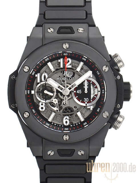 Gehäuse aus Keramik, Gehäusedurchmesser 45 mm, Keramik Lünette, transparentes Zifferblatt mit Leuchtindexen, schwarzes Keramikband mit Faltschließe, Automatikwerk, Chronograph, Manufakturkaliber UNICO HUB1242, Schwingung 28.800 A/h, Gangreserve für ca. 72 Stunden, Datumsanzeige, Saphirglas entspiegelt, Saphirglasboden verschraubt, Wasserdicht bis 10 bar.