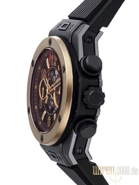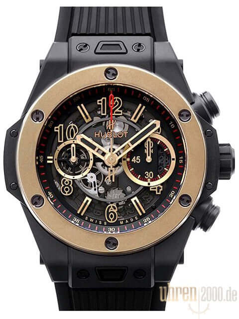 Gehäuse aus schwarzem Keramik, Gehäusedurchmesser 45 mm, Magic Gold Lünette, transparentes Zifferblatt, schwarzes Kautschukband mit Faltschließe aus Titan, Automatikwerk, Manufakturkaliber UNICO HUB1242, Schwingung 28.800 A/h, Gangreserve für ca. 72 Stunden, Chronograph, Datumsanzeige, Saphirglas entspiegelt, Saphirglasboden verschraubt, Wasserdicht bis 10 bar.