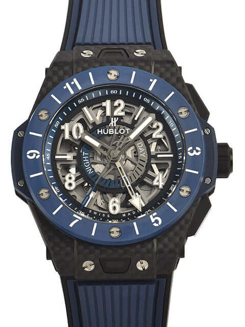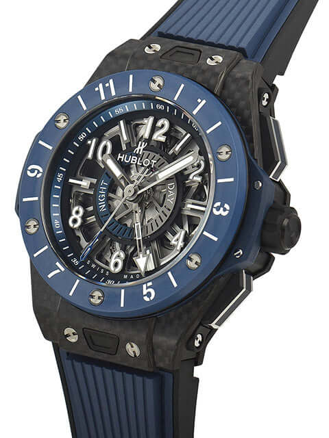 Gehäuse aus Carbon, Gehäusedurchmesser 45 mm, blaue Keramik Lünette, transparentes Zifferblatt mit Leuchtindexen, blau / schwarzes Kautschukband mit Faltschließe aus Titan, Automatikwerk, Chronograph, Manufakturkaliber UNICO HUB1251, Schwingung 28.800 A/h, Gangreserve für ca. 72 Stunden, GMT, Saphirglas entspiegelt, Saphirglasboden verschraubt, Wasserdicht bis 10 bar.