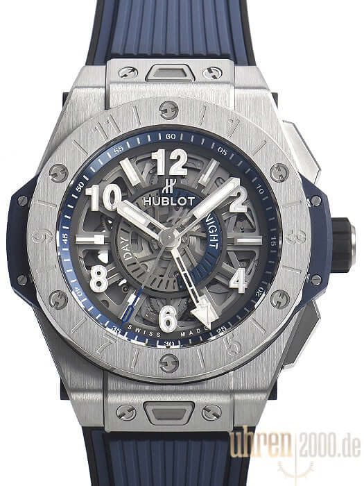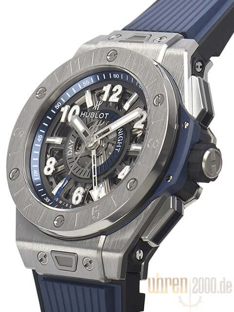Gehäuse aus Titan, Gehäusedurchmesser 45 mm, Lünette aus Titan, transparentes Zifferblatt mit Leuchtindexen, blau / schwarzes Kautschukband mit Faltschließe aus Titan, Automatikwerk, Chronograph, Manufakturkaliber UNICO HUB1251, Schwingung 28.800 A/h, Gangreserve für ca. 72 Stunden, GMT, Saphirglas entspiegelt, Saphirglasboden verschraubt, Wasserdicht bis 10 bar.