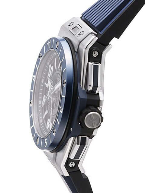 Gehäuse aus Titan, Gehäusedurchmesser 45 mm, blaue Lünette aus Keramik, transparentes Zifferblatt mit Leuchtindexen, blau / schwarzes Kautschukband mit Faltschließe aus Titan, Automatikwerk, Chronograph, Manufakturkaliber UNICO HUB1251, Schwingung 28.800 A/h, Gangreserve für ca. 72 Stunden, GMT, Saphirglas entspiegelt, Saphirglasboden verschraubt, Wasserdicht bis 10 bar.