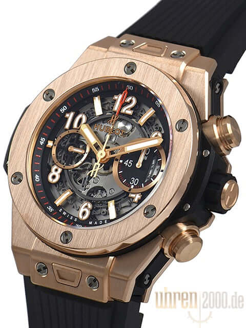 Gehäuse aus 18 kt Rotgold, Gehäusedurchmesser 45 mm, Rotgold Lünette, transparentes Zifferblatt mit Leuchtindexen, schwarzes Kautschukband mit Faltschließe aus Rotgold / Titan, Automatikwerk, Manufakturkaliber UNICO HUB1242, Schwingung 28.800 A/h, Gangreserve für ca. 72 Stunden, Chronograph, Datumsanzeige, Saphirglas entspiegelt, Saphirglasboden verschraubt, Wasserdicht bis 10 bar.