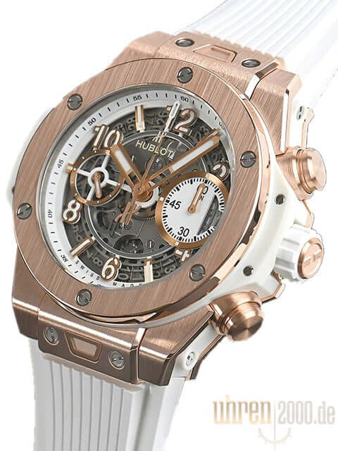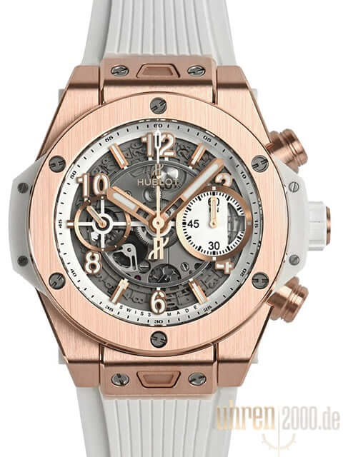 Gehäuse aus satiniertem King Gold, Gehäusedurchmesser 42 mm, Lünette aus satiniertem King Gold, transparentes Zifferblatt mit Leuchtindizes und Leuchtziffern, weißes Kautschukband mit Faltschließe, Automatikwerk, Chronograph, Manufakturkaliber UNICO HUB1280, Schwingung 28.800 A/h, Gangreserve für ca. 72 Stunden, Datumsanzeige, Saphirglas entspiegelt, Saphirglasboden verschraubt, Wasserdicht bis 10 bar.