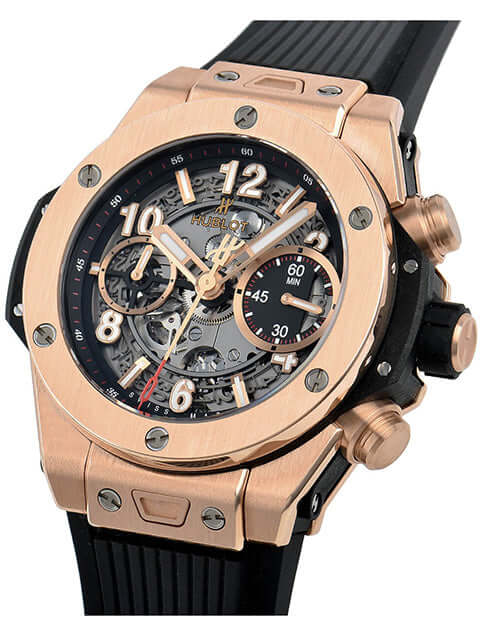 Gehäuse aus satiniertem King Gold, Gehäusedurchmesser 42 mm, Lünette aus satiniertem King Gold, transparentes Zifferblatt mit Leuchtindizes und Leuchtziffern, schwarzes Kautschukband mit Faltschließe, Automatikwerk, Chronograph, Manufakturkaliber UNICO HUB1280, Schwingung 28.800 A/h, Gangreserve für ca. 72 Stunden, Datumsanzeige, Saphirglas entspiegelt, Saphirglasboden verschraubt, Wasserdicht bis 10 bar.