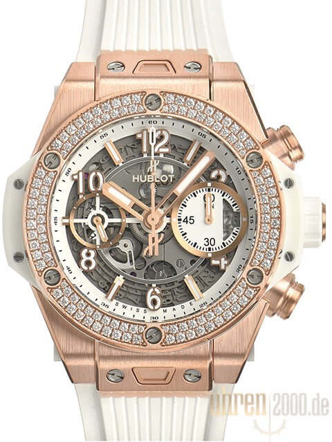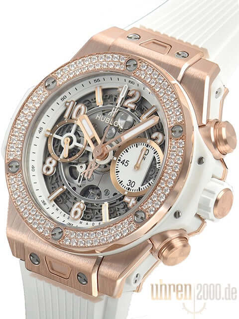 Gehäuse aus satiniertem King Gold, Gehäusedurchmesser 42 mm, Lünette aus King Gold mit 126 Diamanten besetzt, transparentes Zifferblatt mit Leuchtindizes und Leuchtziffern, weißes Kautschukband mit Faltschließe, Automatikwerk, Chronograph, Manufakturkaliber UNICO HUB1280, Schwingung 28.800 A/h, Gangreserve für ca. 72 Stunden, Datumsanzeige, Saphirglas entspiegelt, Saphirglasboden verschraubt, Wasserdicht bis 10 bar.