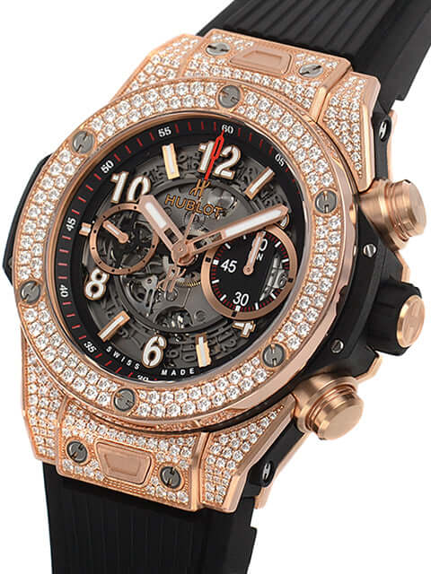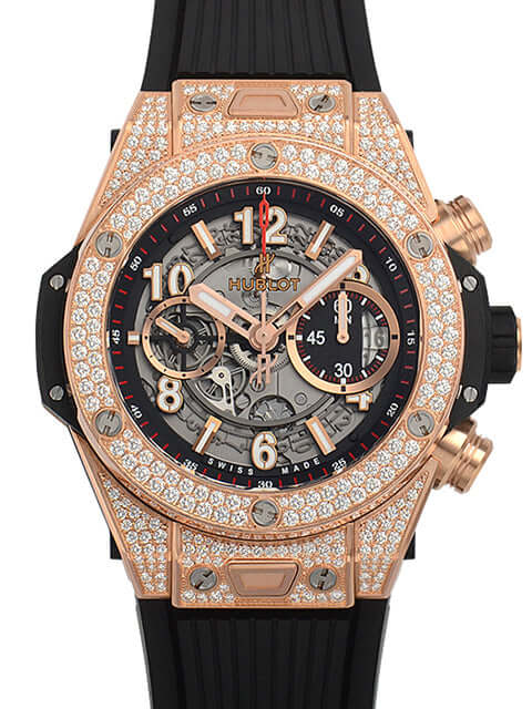 Gehäuse aus 18 kt Rotgold mit 176 Diamanten besetzt, Gehäusedurchmesser 45 mm, 18 kt Rotgold Lünette mit 114 Diamanten besetzt, transparentes Zifferblatt mit Leuchtindexen, schwarzes Kautschukband mit Faltschließe aus Rotgold / Titan, Automatikwerk, Manufakturkaliber UNICO HUB1242, Schwingung 28.800 A/h, Gangreserve für ca. 72 Stunden, Chronograph, Datumsanzeige, Saphirglas entspiegelt, Saphirglasboden verschraubt, Wasserdicht bis 10 bar.