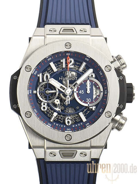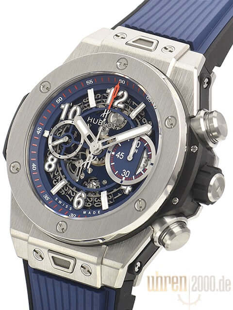 Gehäuse aus satiniertem Titan, Gehäusedurchmesser 45,5 mm, Lünette aus satiniertem Titan, transparentes Zifferblatt mit Leuchtindizes und Leuchtziffern, blaues Kautschukband mit Faltschließe aus Titan, Automatikwerk, Chronograph, Manufakturkaliber UNICO HUB1242, Schwingung 28.800 A/h, Gangreserve für ca. 72 Stunden, Datumsanzeige, Saphirglas entspiegelt, Saphirglasboden verschraubt, Wasserdicht bis 10 bar.