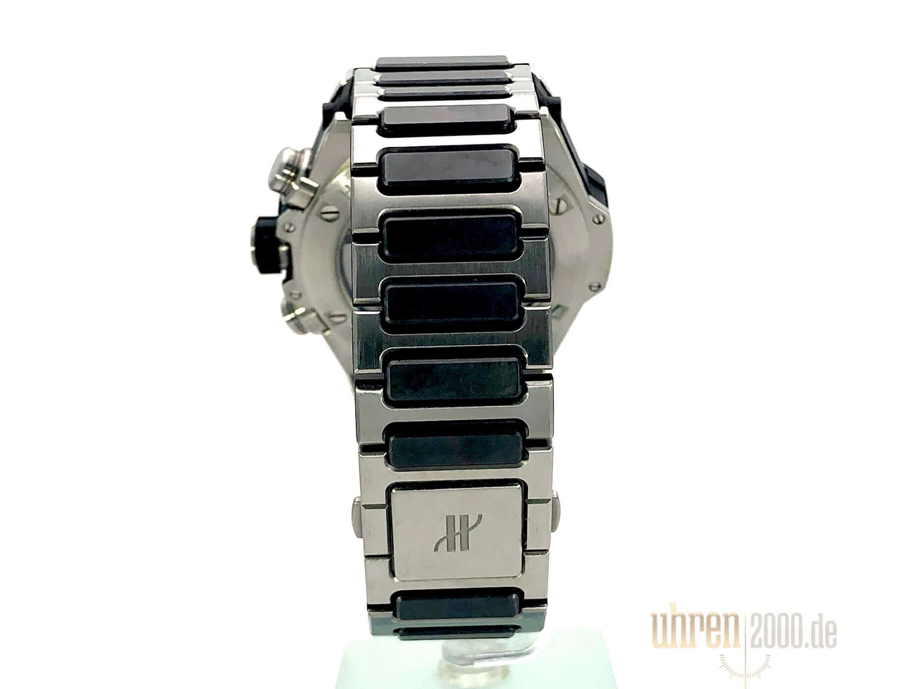 Gehäuse aus satiniertem Titan, Gehäusedurchmesser 45,5 mm, Lünette aus satiniertem Keramik, Titan / Keramikband mit Faltschließe sowie schwarzes Kautschukband mit Faltschließe aus Titan, transparentes Zifferblatt mit Leuchtindizes, Automatikwerk, Manufakturkaliber UNICO HUB1242, Schwingung 28.800 A/h, Gangreserve für ca. 72 Stunden, Chronograph, Datumsanzeige, Saphirglas entspiegelt, Saphirglasboden verschraubt, Wasserdicht bis 10 bar.
