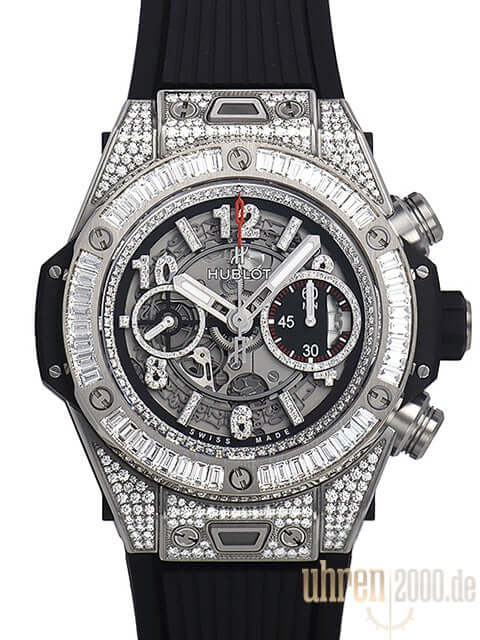 Gehäuse aus Titan mit 176 Diamanten besetzt, Gehäusedurchmesser 45,5 mm, Lünette aus Titan mit Diamanten Baguette besetzt, transparentes Zifferblatt mit 212 Diamanten besetzt, Kautschuk Armband mit Faltschließe aus Titan, Automatikwerk, Chronograph, Manufakturkaliber UNICO HUB1242, Schwingung 28.800 A/h, Gangreserve für ca. 72 Stunden, Datumsanzeige, Saphirglas entspiegelt, Saphirglasboden verschraubt, Wasserdicht bis 10 bar.