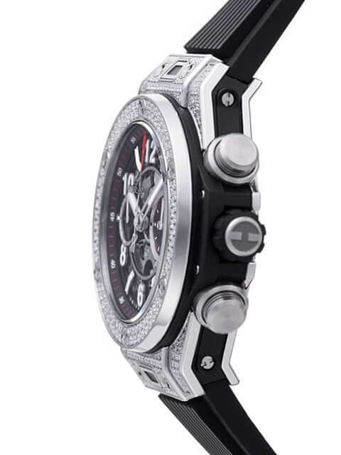 Gehäuse aus satiniertem Titan mit Diamanten besetzt, Gehäusedurchmesser 45,5 mm, Lünette aus Titan mit Diamanten besetzt, transparentes Zifferblatt mit Leuchtindexen, Kautschuk Armband mit Faltschließe aus Titan, Automatikwerk, Chronograph, Manufakturkaliber UNICO HUB1242, Schwingung 28.800 A/h, Gangreserve für ca. 72 Stunden, Datumsanzeige, Saphirglas entspiegelt, Saphirglasboden verschraubt, Wasserdicht bis 10 bar.