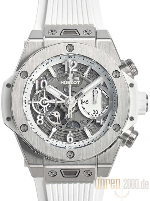 Gehäuse aus satiniertem Titan, Gehäusedurchmesser 42 mm, Lünette aus satiniertem Titan, transparentes Zifferblatt mit Leuchtindizes und Leuchtziffern, weißes Kautschukband mit Faltschließe aus Titan, Automatikwerk, Chronograph, Manufakturkaliber UNICO HUB1280, Schwingung 28.800 A/h, Gangreserve für ca. 72 Stunden, Datumsanzeige, Saphirglas entspiegelt, Saphirglasboden verschraubt, Wasserdicht bis 10 bar.
