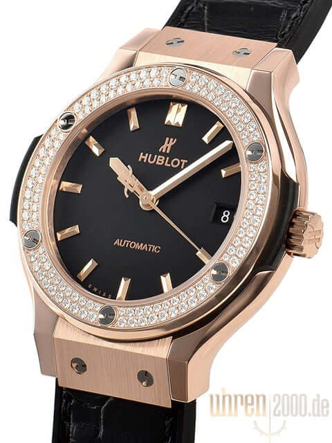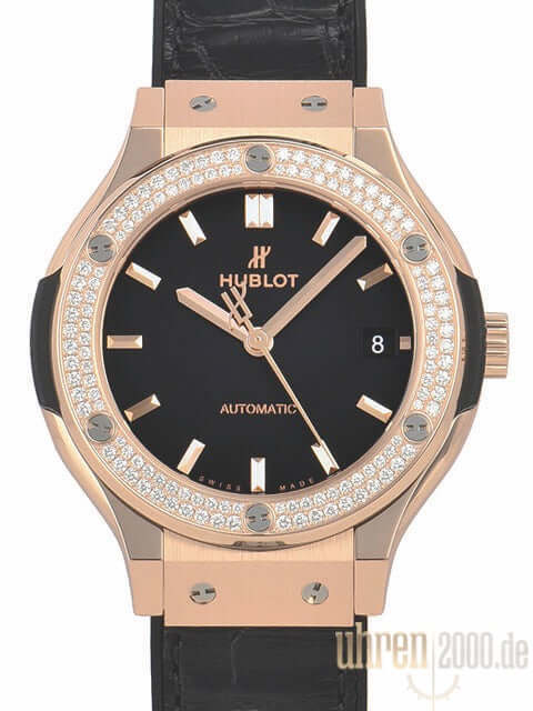 Gehäuse aus King Gold poliert und satiniert, Gehäusedurchmesser 38 mm, King Gold Lünette mit 126 Diamanten besetzt, schwarzes Kautschukarmband mit Alligatorlederinlay und Faltschließe, schwarzes Zifferblatt, Automatikwerk, Kaliber HUB1110 mit 21 Steine, Gangreserve für ca. 42 Stunden, Datumsanzeige, Saphirglas entspiegelt, Saphirglasboden verschraubt und graviert, Wasserdicht bis 5 bar.