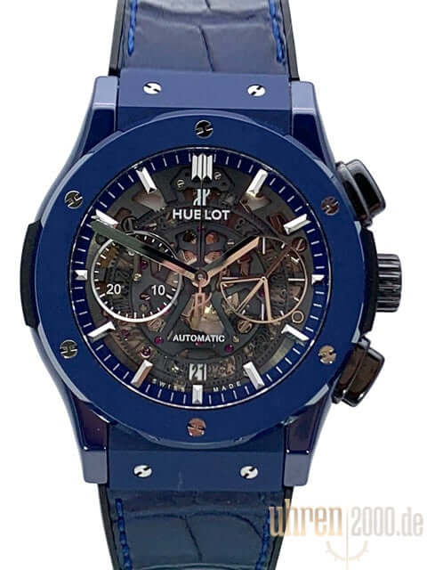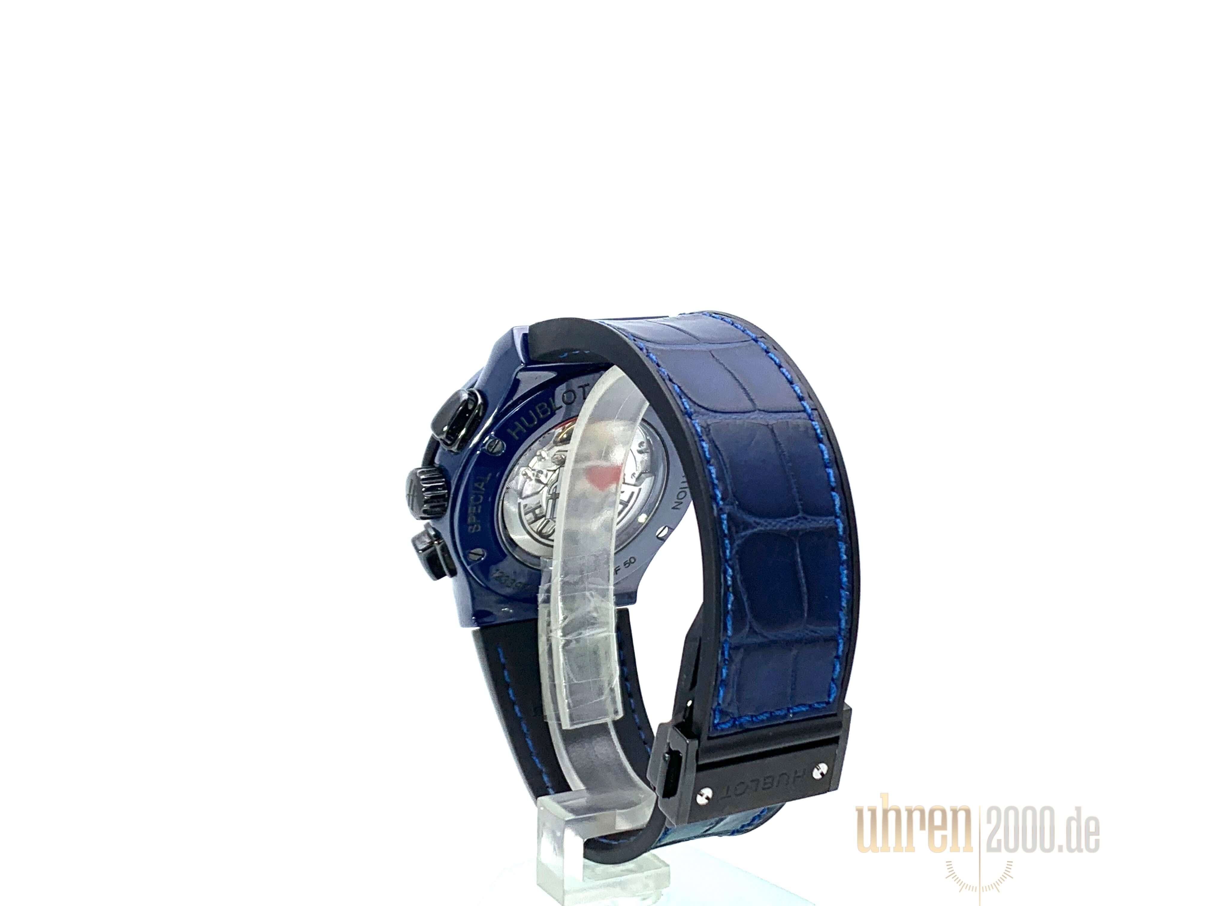 Gehäuse aus blauer Keramik poliert und satiniert, Gehäusedurchmesser 45 mm, Keramik Lünette poliert und satiniert, transparentes Zifferblatt, Kautschukband mit blauem Alligatorlederinlay und Faltschließe, Automatikwerk, Kaliber HUB1155, Gangreserve für ca. 42 Stunden, Datumsanzeige, Saphirglas entspiegelt, Saphirglasboden verschraubt und graviert, Wasserdicht bis 5 bar, limitiert auf 50 Stück.