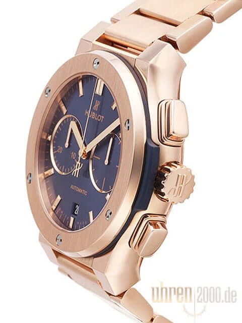 Gehäuse aus 18 kt Roségold poliert und satiniert, Gehäusedurchmesser 45 mm, Lünette Roségold poliert und satiniert, Roségoldband mit Faltschließe, blaues Zifferblatt, Automatikwerk, Manufakturkaliber HUB1143 mit 59 Steine, Gangreserve für ca. 42 Stunden, Chronograph, Datumsanzeige, Saphirglas entspiegelt, Saphirglasboden verschraubt und graviert, Wasserdicht bis 5 bar.