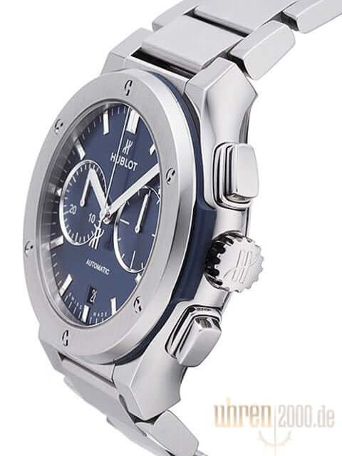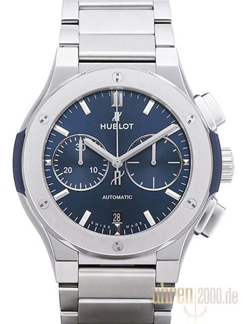 Gehäuse Titan poliert und satiniert, Gehäusedurchmesser 45 mm, Lünette Titan poliert und satiniert, Titanarmband mit Faltschließe, blaues Zifferblatt, Automatikwerk, Manufakturkaliber HUB1143 mit 59 Steine, Gangreserve für ca. 42 Stunden, Chronograph, Datumsanzeige, Saphirglas entspiegelt, Saphirglasboden verschraubt und graviert, Wasserdicht bis 5 bar.