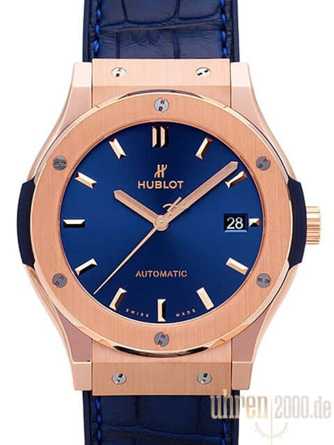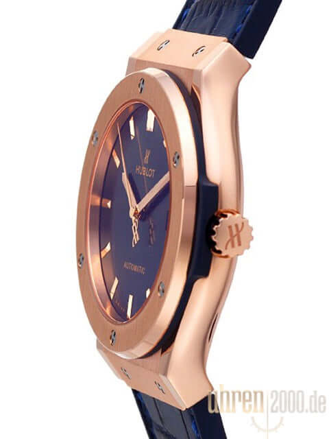Gehäuse aus 18 kt Roségold poliert und satiniert, Gehäusedurchmesser 45 mm, Lünette Roségold poliert und satiniert, blaues Kautschuk / Krokolederband mit Faltschließe, blaues Zifferblatt, Automatikwerk, Manufakturkaliber HUB1112 mit 21 Steine, Gangreserve für ca. 42 Stunden, Datumsanzeige, Saphirglas entspiegelt, Saphirglasboden verschraubt und graviert, Wasserdicht bis 5 bar.