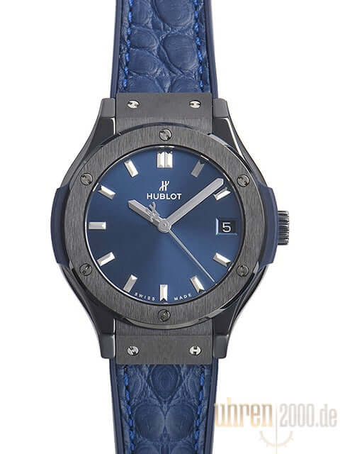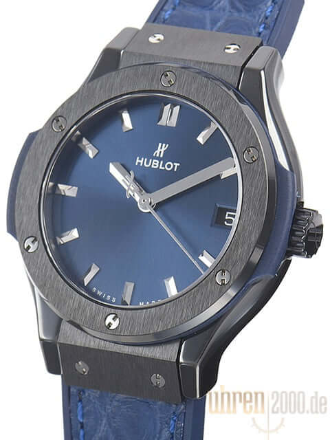 Gehäuse aus Ceramic poliert und satiniert, Gehäusedurchmesser 33 mm, Ceramic Lünette poliert und satiniert, blaues Kautschukband mit Krokodilleder Einlage und Faltschließe, blaues Zifferblatt, Quarzwerk, Kaliber HUB2912, Datumsanzeige, Saphirglas entspiegelt, Boden verschraubt und graviert, Wasserdicht bis 5 bar.