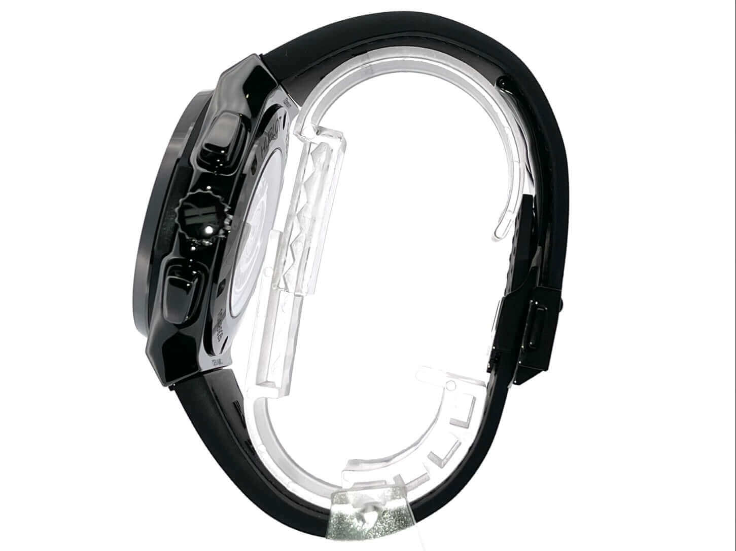 Gehäuse aus Keramik poliert und satiniert, Gehäusedurchmesser 45 mm, Keramik Lünette poliert und satiniert, transparentes Zifferblatt, Krokodilleder/Kautschuk Armband mit Faltschließe, Automatikwerk, Kaliber HUB1155, Gangreserve für ca. 42 Stunden, Datumsanzeige, Saphirglas entspiegelt, Saphirglasboden verschraubt und graviert, Wasserdicht bis 5 bar.