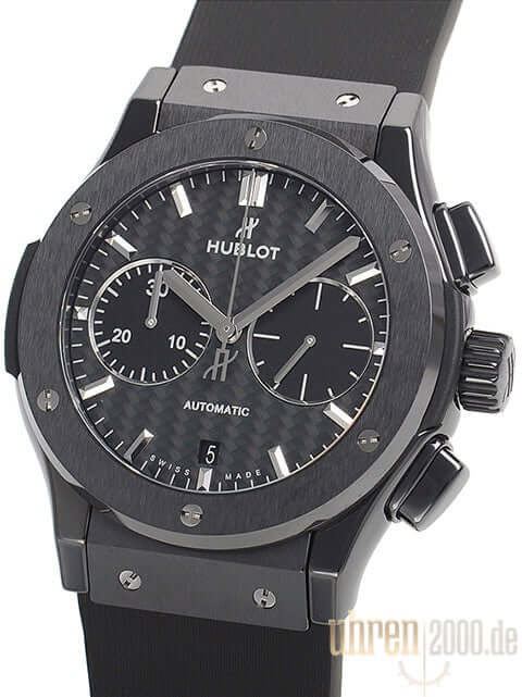 Gehäuse Keramik poliert und satiniert, Gehäusedurchmesser 45 mm, Lünette Keramik poliert und satiniert, Zifferblatt schwarzes Carbon, schwarzes Kautschukarmband mit Faltschließe, Automatikwerk, Manufakturkaliber HUB1143 mit 59 Steine, Gangreserve für ca. 42 Stunden, Datumsanzeige, Saphirglas entspiegelt, Saphirglasboden verschraubt und graviert, Wasserdicht bis 5 bar.