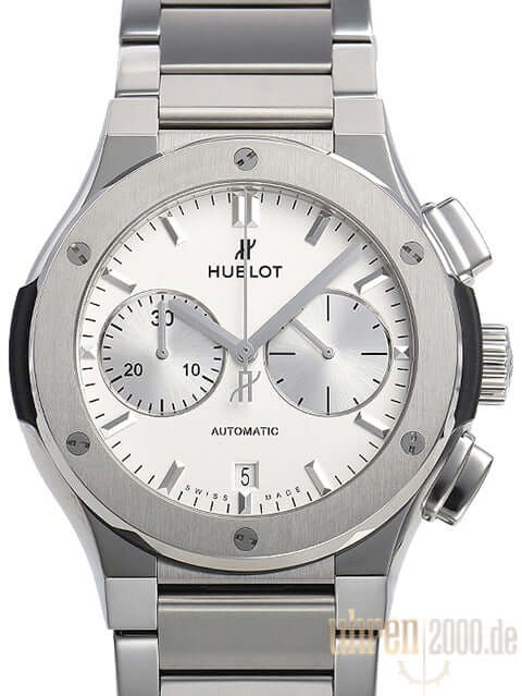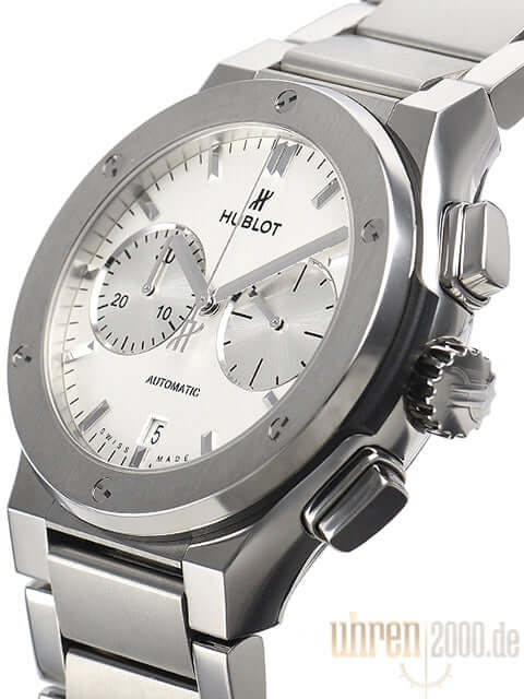 Gehäuse Titan poliert und satiniert, Gehäusedurchmesser 45 mm, Lünette Titan poliert und satiniert, Titanarmband mit Faltschließe, silberfarbenes Zifferblatt, Automatikwerk, Manufakturkaliber HUB1143 mit 59 Steine, Gangreserve für ca. 42 Stunden, Chronograph, Datumsanzeige, Saphirglas entspiegelt, Saphirglasboden verschraubt und graviert, Wasserdicht bis 5 bar.