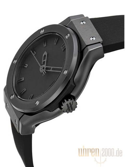 Gehäuse Keramik poliert und satiniert, Gehäusedurchmesser 33 mm, Keramik Lünette poliert und satiniert, schwarzes Zifferblatt, schwarzes Kautschukband mit Faltschließe, Quarzwerk, Kaliber HUB2912, Datumsanzeige, Saphirglas entspiegelt, Boden verschraubt und graviert, Wasserdicht bis 5 bar, limitiert auf 500 Stück.