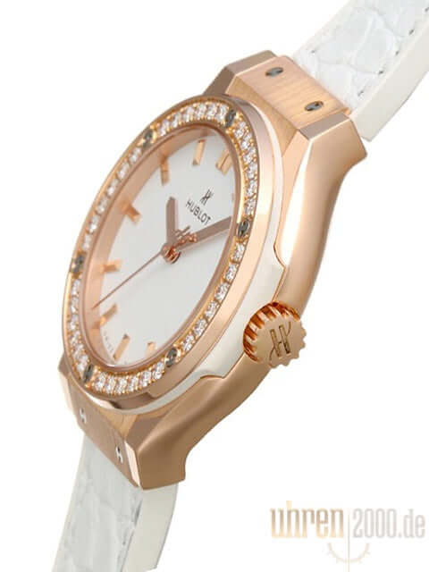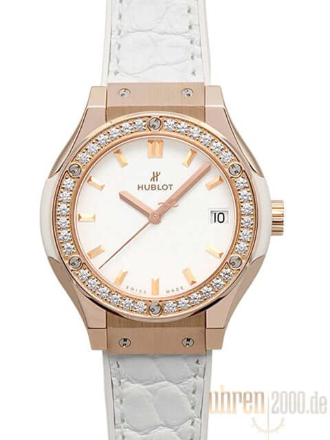 Gehäuse aus King Gold poliert und satiniert, Gehäusedurchmesser 33 mm, King Gold Lünette mit Diamanten, weißes Zifferblatt, weißes Kautschukband mit Faltschließe, Quarzwerk, Kaliber HUB2912, Datumsanzeige, Saphirglas entspiegelt, King Gold Boden verschraubt und graviert, Wasserdicht bis 5 bar.