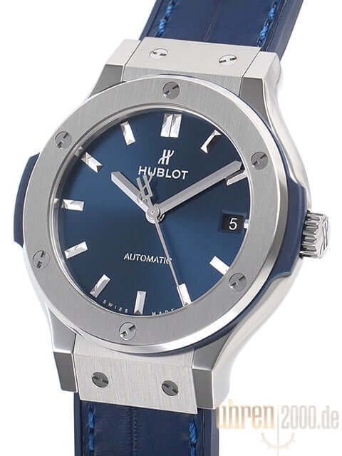 Gehäuse aus Titan poliert und satiniert, Gehäusedurchmesser 38 mm, Titan Lünette poliert und satiniert, blaues Kautschukarmband mit blauem Alligatorlederinlay und Faltschließe, blaues Zifferblatt, Automatikwerk, Kaliber HUB1110 mit 21 Steine, Gangreserve für ca. 42 Stunden, Datumsanzeige, Saphirglas entspiegelt, Saphirglasboden verschraubt und graviert, Wasserdicht bis 5 bar.