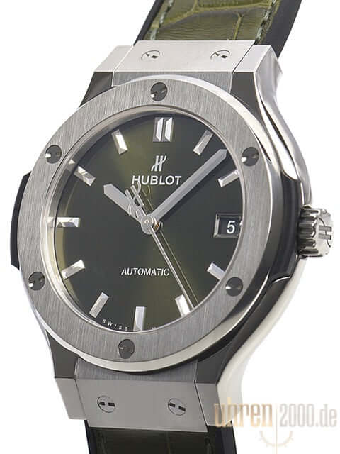 Gehäuse aus Titan poliert und satiniert, Gehäusedurchmesser 38 mm, Titan Lünette poliert und satiniert, Kautschukarmband mit grünem Alligatorlederinlay und Faltschließe, grünes Zifferblatt, Automatikwerk, Kaliber HUB1110 mit 21 Steine, Gangreserve für ca. 42 Stunden, Datumsanzeige, Saphirglas entspiegelt, Saphirglasboden verschraubt und graviert, Wasserdicht bis 5 bar.