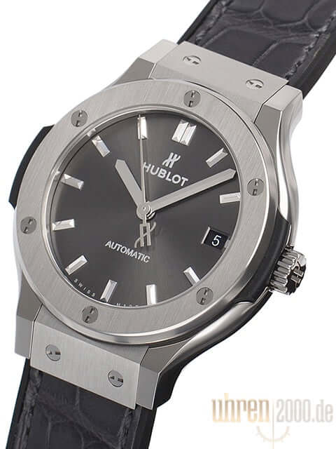 Gehäuse aus Titan poliert und satiniert, Gehäusedurchmesser 38 mm, Titan Lünette poliert und satiniert, graues Zifferblatt, Kautschukarmband mit grauem Alligatorlederinlay und Faltschließe, Automatikwerk, Kaliber HUB1110 mit 21 Steine, Gangreserve für ca. 42 Stunden, Datumsanzeige, Saphirglas entspiegelt, Saphirglasboden verschraubt und graviert, Wasserdicht bis 5 bar.