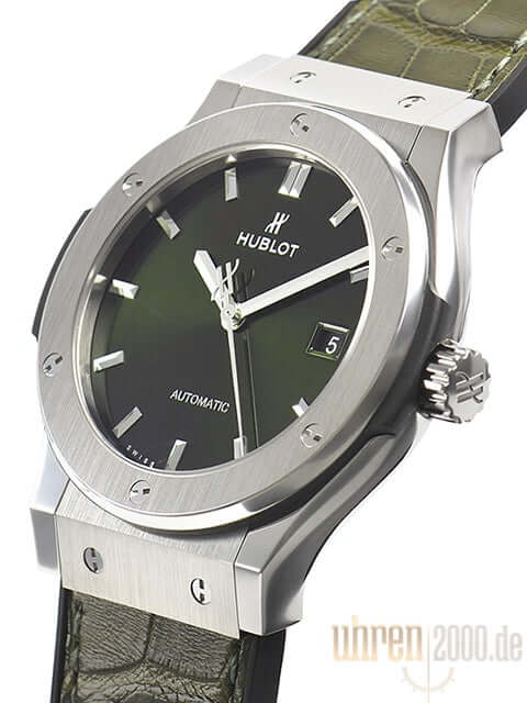 Gehäuse aus Titan poliert und satiniert, Gehäusedurchmesser 42 mm, Titan Lünette poliert und satiniert, grünes Zifferblatt, schwarzes Kautschukarmband mit grünem Alligatorlederinlay und Faltschließe, Automatikwerk, Kaliber HUB1110 mit 21 Steine, Gangreserve für ca. 42 Stunden, Datumsanzeige, Saphirglas entspiegelt, Saphirglasboden verschraubt und graviert, Wasserdicht bis 5 bar.