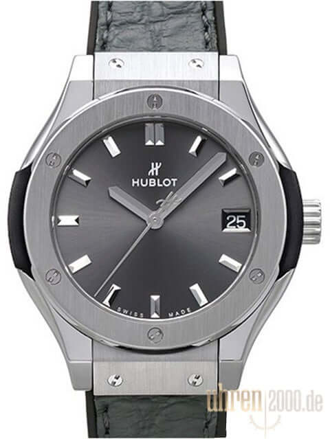 Gehäuse aus Titan poliert und satiniert, Gehäusedurchmesser 33 mm, Titan Lünette poliert und satiniert, graues Zifferblatt, graues Kautschukband mit Krokodilleder Einlage und Faltschließe, Quarzwerk, Kaliber HUB2912, Datumsanzeige, Saphirglas entspiegelt, Boden verschraubt und graviert, Wasserdicht bis 5 bar.