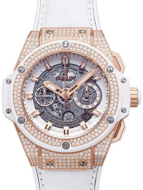 Gehäuse 18 kt Rosegold satiniert mit Diamanten besetzt, Gehäusedurchmesser 48 mm, Gehäusehöhe 17,6 mm, Lünette mit Diamanten, transparentes Zifferblatt mit Leuchtindexen, Armband Kautschuk/Alligator Weiß mit Faltschließe in 18 kt Rosegold, Automatikwerk, Manufakturkaliber UNICO HUB1240 mit 38 Steine, Schwingung 28.800 A/h, Gangreserve für ca. 72 Stunden, Datumsanzeige, Saphirglas entspiegelt, Saphirglasboden verschraubt, Wasserdicht bis 10 bar.