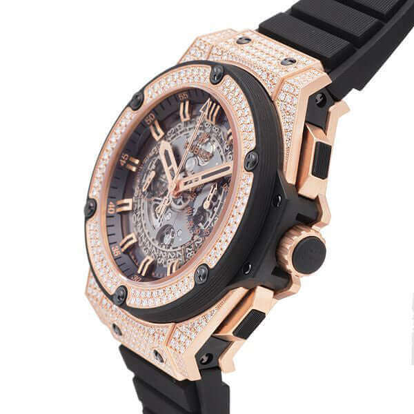 Gehäuse aus 18 kt Rosegold satiniert mit Diamanten besetzt, Gehäusedurchmesser 48 mm, Gehäusehöhe 17,6 mm, Lünette mit Diamanten, transparentes Zifferblatt mit Leuchtindexen, Armband Kautschuk Schwarz mit 18 kt Rosegold Faltschließe, Automatikwerk, Manufakturkaliber UNICO HUB1240 mit 38 Steine, Schwingung 28.800 A/h, Gangreserve für ca. 72 Stunden, Datumsanzeige, Saphirglas entspiegelt, Saphirglasboden verschraubt, Wasserdicht bis 10 bar.