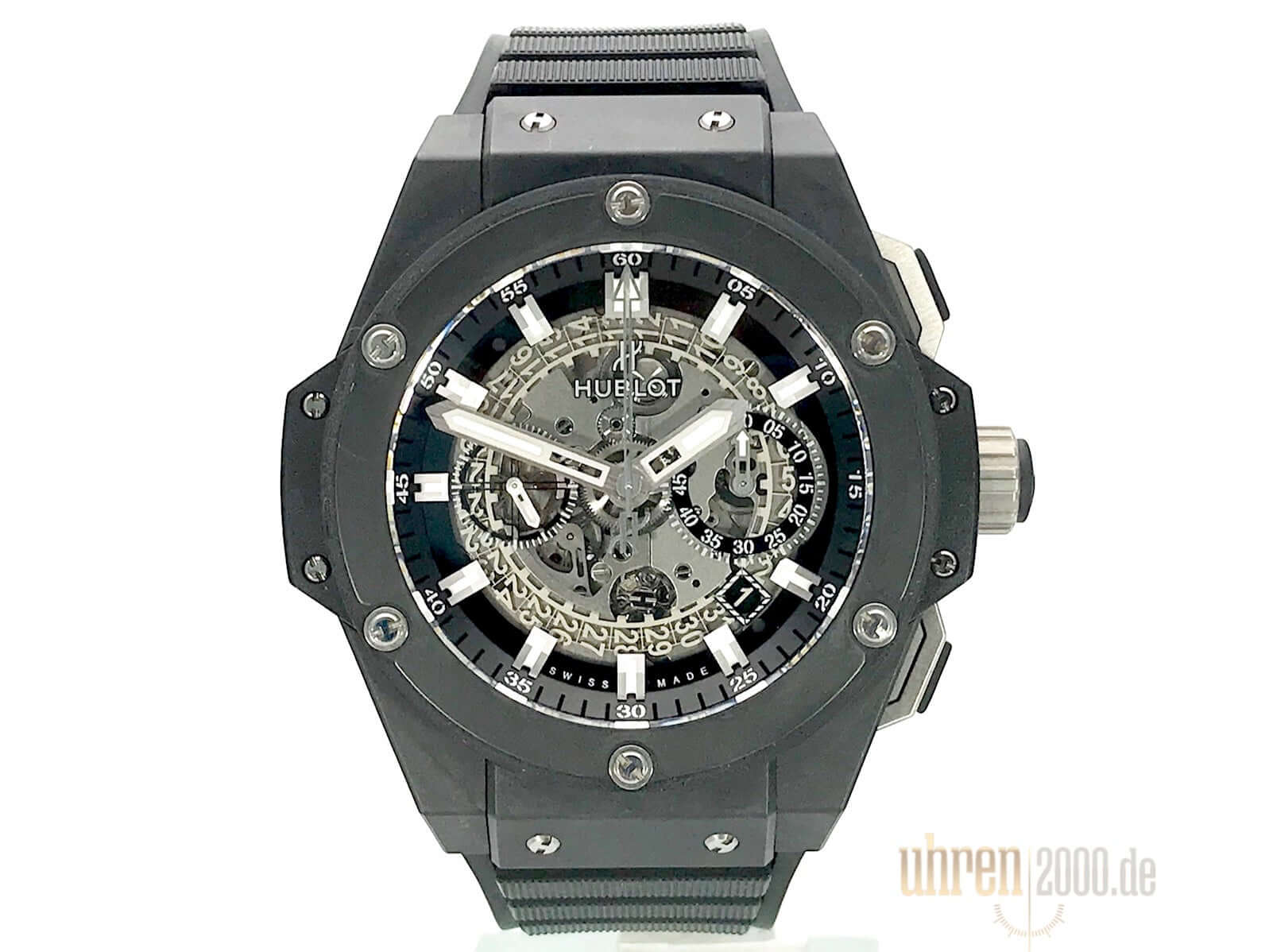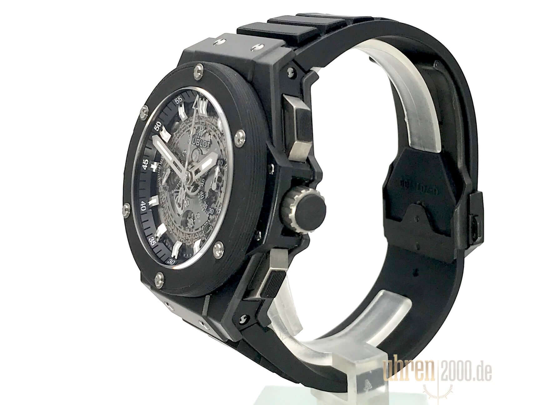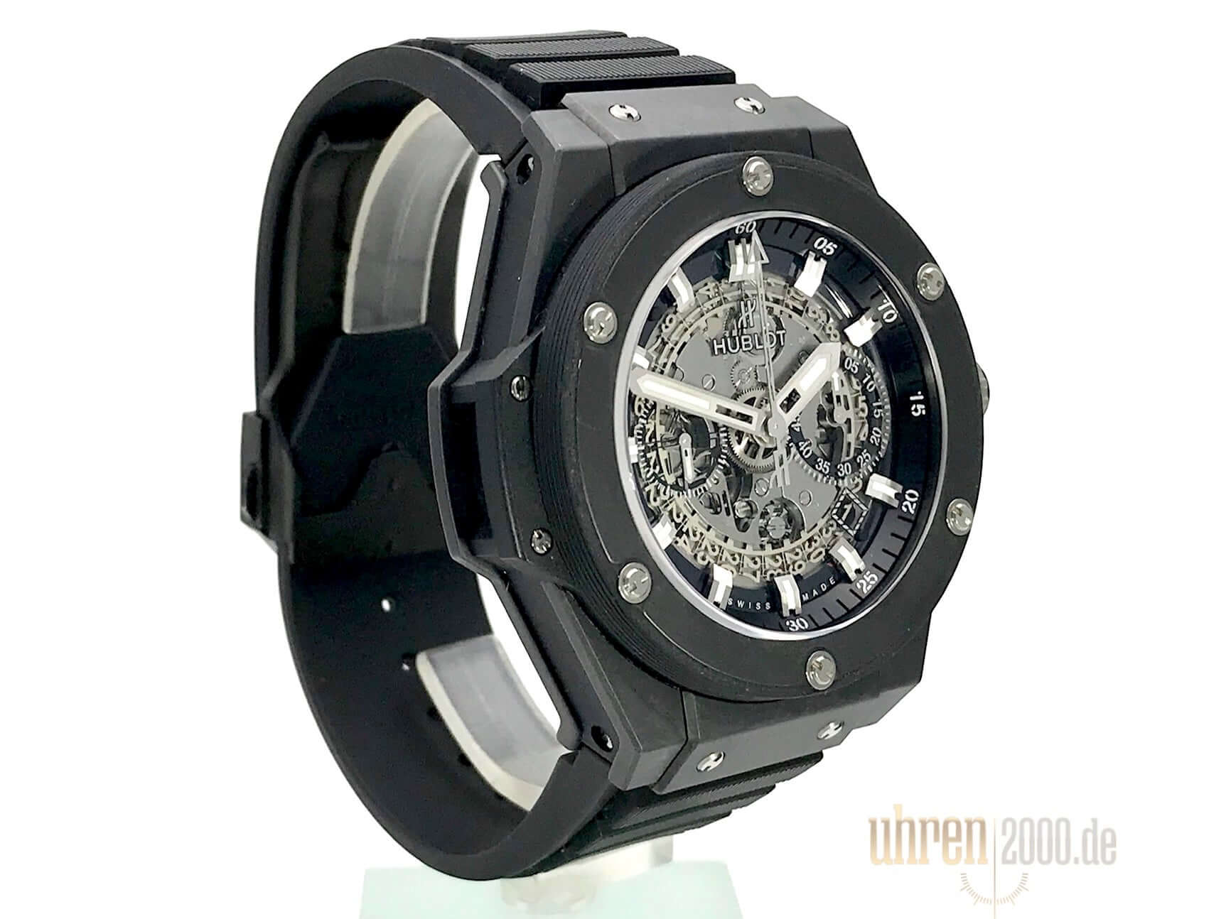 Gehäuse Keramik, Gehäusedurchmesser 48 mm, Lünette Keramik, transparentes Zifferblatt mit Leuchtindexen, schwarzes Kautschukband mit Faltschließe, Automatikwerk, Manufakturkaliber UNICO HUB1240 mit 38 Steine, Schwingung 28.800 A/h, Gangreserve für ca. 72 Stunden, Datumsanzeige, Saphirglas entspiegelt, Saphirglasboden verschraubt, Wasserdicht bis 10 bar.