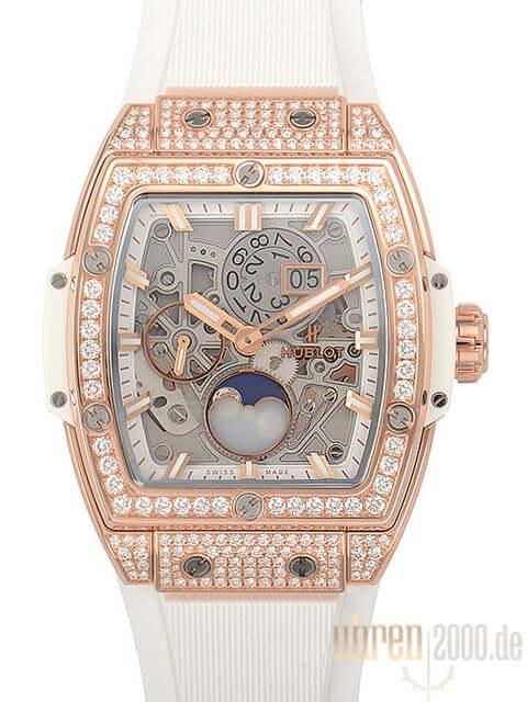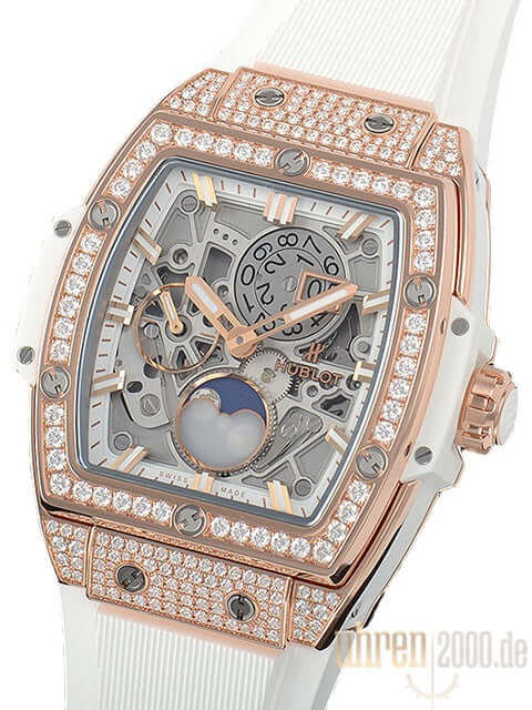 Gehäuse aus King Gold mit 156 Diamanten 0.89ct besetzt, Gehäusedurchmesser 42 mm, polierte King Gold Lünette mit 48 Diamanten 0,58ct besetzt, weißes Kautschukarmband mit Faltschließe, weißes Zifferblatt, Automatikwerk, Manufakturkaliber HUB1770, Gangreserve für ca. 50 Stunden, Datumsanzeige, Mondphase, Saphirglas entspiegelt, Saphirglasboden verschraubt und graviert, Wasserdicht bis 10 bar.