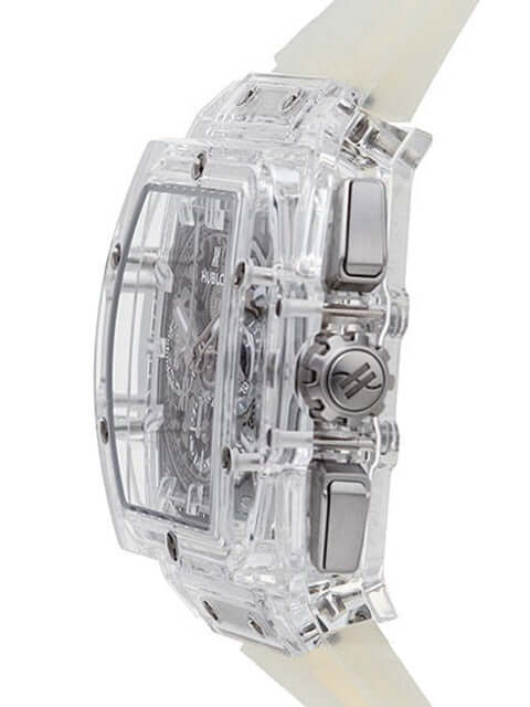 Gehäuse aus Saphirglas poliert, Gehäusedurchmesser 42 mm, Saphirglas Lünette poliert, weißes Kautschukband mit Faltschließe, transparentes Zifferblatt, Automatikwerk, Chronograph, Manufakturkaliber HUB4700, Gangreserve für ca. 50 Stunden, Datumsanzeige, Saphirglas entspiegelt, Saphirglasboden verschraubt und graviert, Wasserdicht bis 10 bar, limitiert auf 200 Stück.