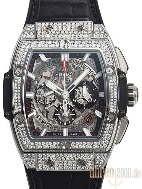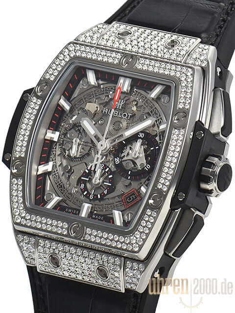 Gehäuse Titan mit 156 Diamanten 0,89ct besetzt, Gehäusedurchmesser 42 mm, Titan Lünette mit 164 Diamanten 0,90ct besetzt, schwarzes Zifferblatt, schwarzes Kautschuk / Lederarmband mit Faltschließe, Automatikwerk, Chronograph, Manufakturkaliber HUB4700, Gangreserve für ca. 50 Stunden, Datumsanzeige, Saphirglas entspiegelt, Saphirglasboden verschraubt und graviert, Wasserdicht bis 10 bar.
