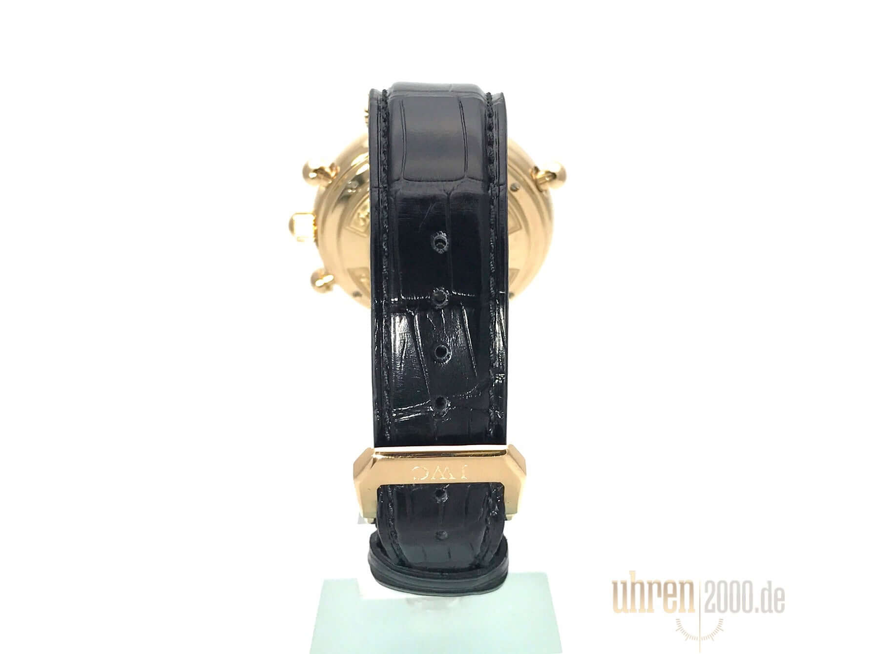 Gehäuse aus 18 kt Rotgold, Gehäusedurchmesser 41,5 mm, Gehäusehöhe 16 mm, 18 kt Rotgold Lünette poliert, schwarzes Krokodilleder mit 18 kt Rotgold Faltschließe, Zifferblatt silberfarben mit arabischen Ziffern, Mechanisches Uhrwerk, Kaliber IWC 79252, Schwingung 28.800 A/h, Ewiger Kalender mit Anzeige von Datum, Wochentag, Monat, Jahr, Mondphase, kleine Sekunde mit Stoppvorrichtung, Saphirglas, Gehäuseboden verschraubt und graviert, Wasserdicht bis zu 3 bar.