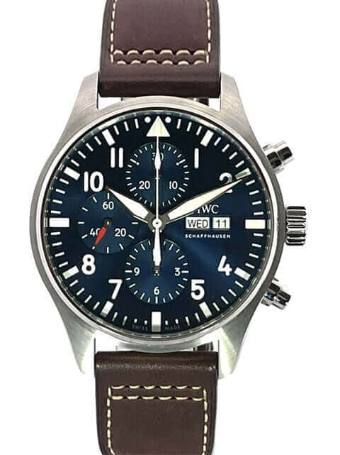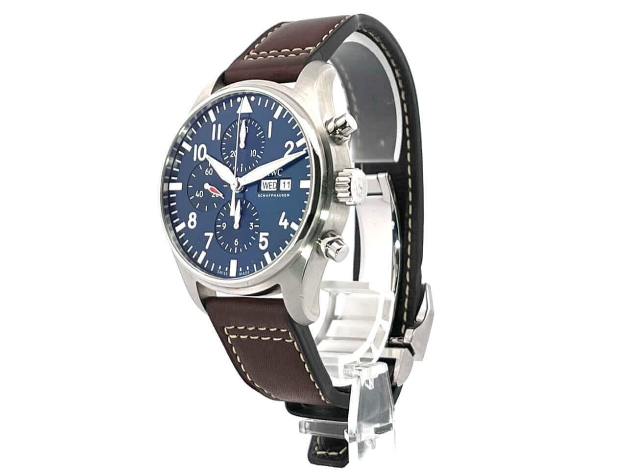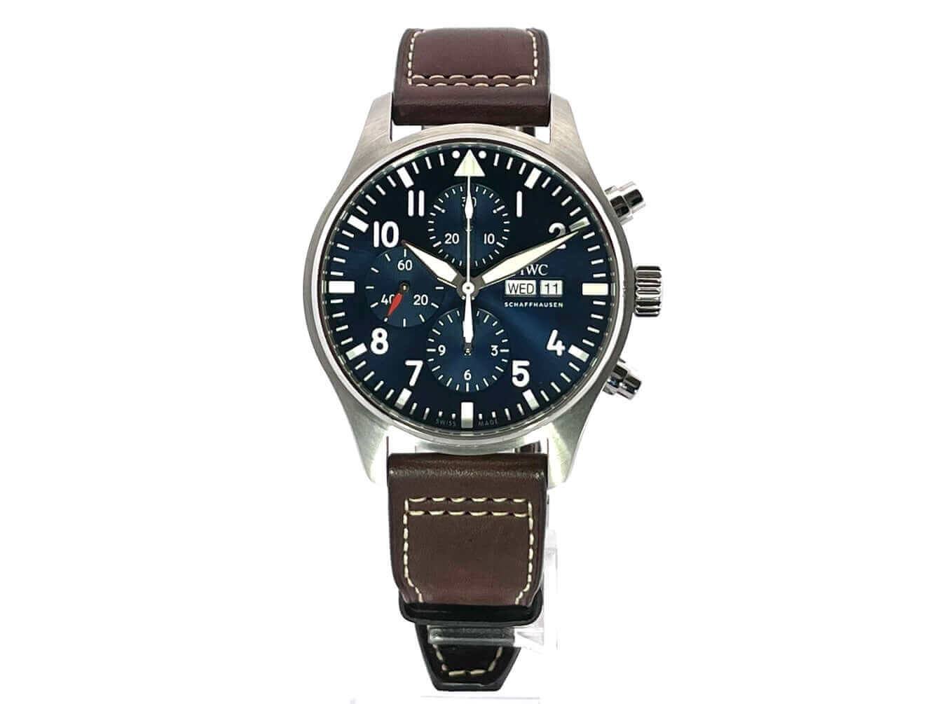 Gehäuse aus Edelstahl poliert und satiniert, Gehäusedurchmesser 43 mm, Gehäusehöhe 15 mm, braunes Lederband mit Faltschließe, blaues Zifferblatt, Automatikwerk, Chronograph, IWC Kaliber 79320, Datumsanzeige, Wochentagsanzeige, Gangreserve 44 Stunden, Saphirglas, Wasserdicht bis zu 6 bar.