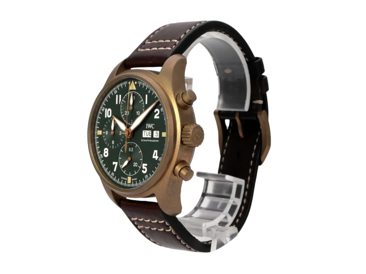 Gehäuse aus Bronze satiniert, Gehäusedurchmesser 41 mm, Höhe 15,30 mm, braunes Lederarmband mit Dornschließe, grünes Zifferblatt, Automatik, vollständige IWC Eigenfertigung, Kaliber 69380, 33 Steine, Gangreserve 46 Stunden, Datumsanzeige, Wochentag, verschraubte Krone, kleine Sekunde, spezielle Bodengravur, wasserdicht bis zu 6 bar.