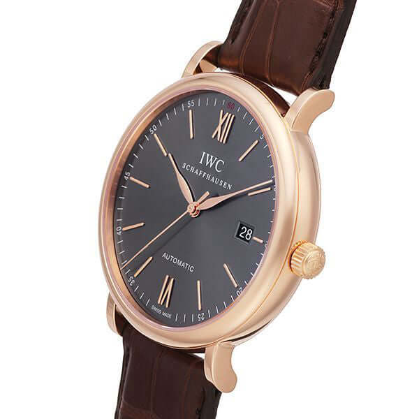 Gehäuse aus 18 kt Rotgold poliert, Gehäusedurchmesser 40 mm, Gehäusehöhe 9,5 mm, braunes Lederarmband mit 18 kt Rotgold Dornschließe, schieferfarbenes Zifferblatt mit aufgesetzten Rotgold Indexe, Rotgold Zeiger, Automatikwerk, Kaliber IWC 35111, Schwingung 28.800 A/h, Gangreserve für 42 Stunden, Datum, kratzfestes Saphirglas, verschraubter 18 kt Rotgold Boden, Wasserdicht bis zu 3 bar.