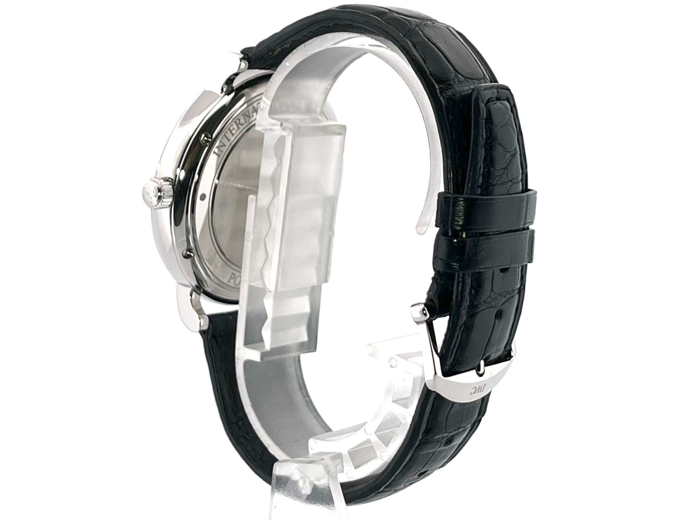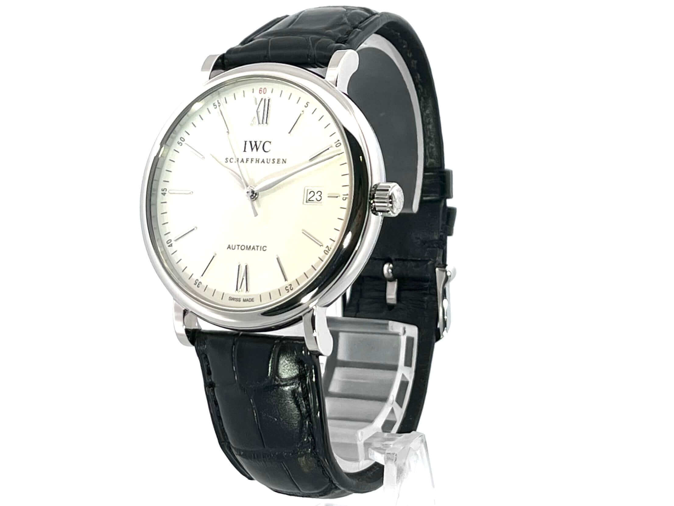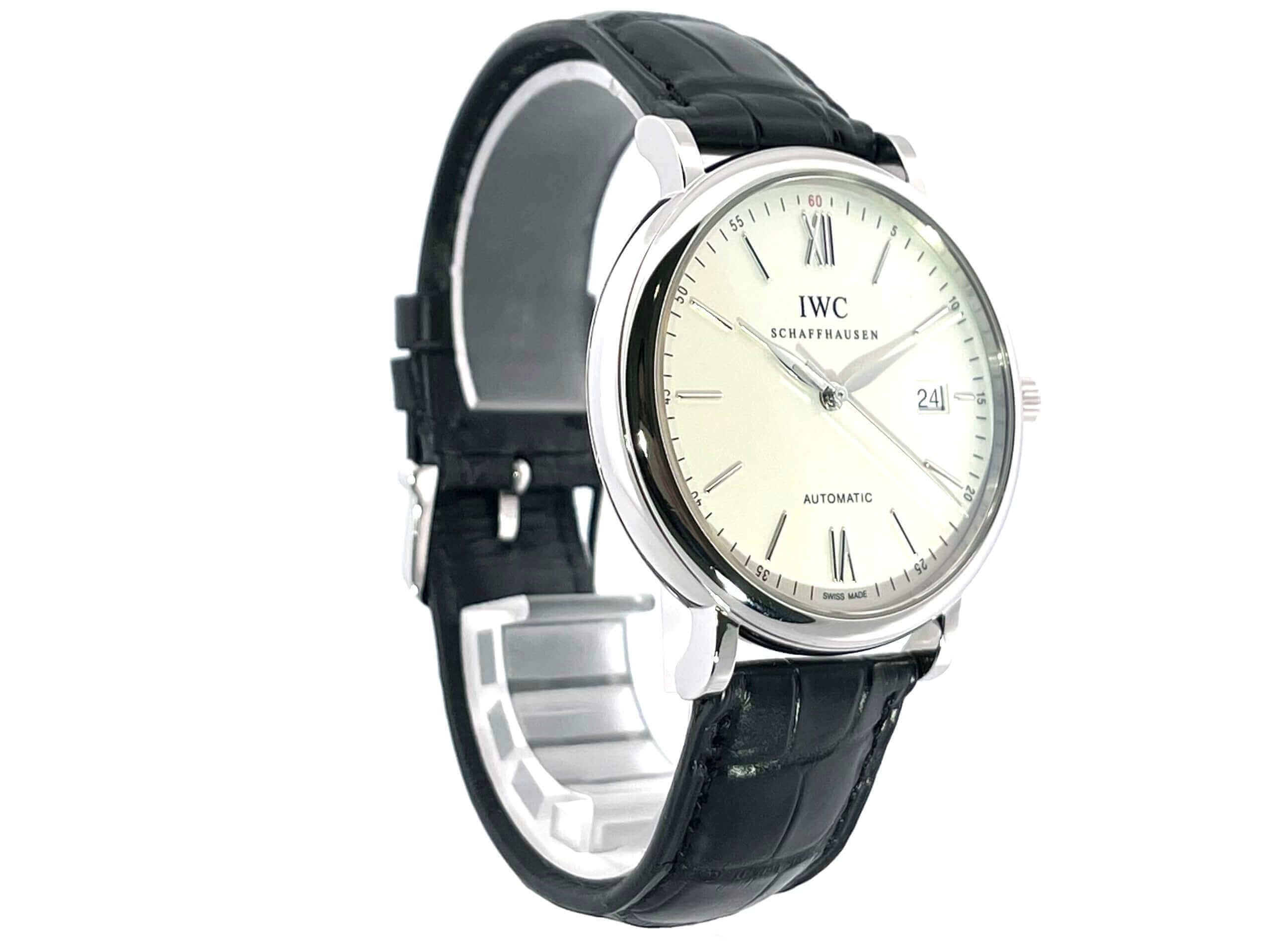 Gehäuse aus Edelstahl poliert, Gehäusedurchmesser 40 mm, Gehäusehöhe 9,5 mm, schwarzes Lederarmband mit Dornschließe, silberfarbenes Zifferblatt mit aufgesetzten Indizes, Automatikwerk, Kaliber IWC 35111, Schwingung 28.800 A/h, Gangreserve für 42 Stunden, Datum, kratzfestes Saphirglas, verschraubter Boden aus Edelstahl, Wasserdicht bis zu 3 bar.