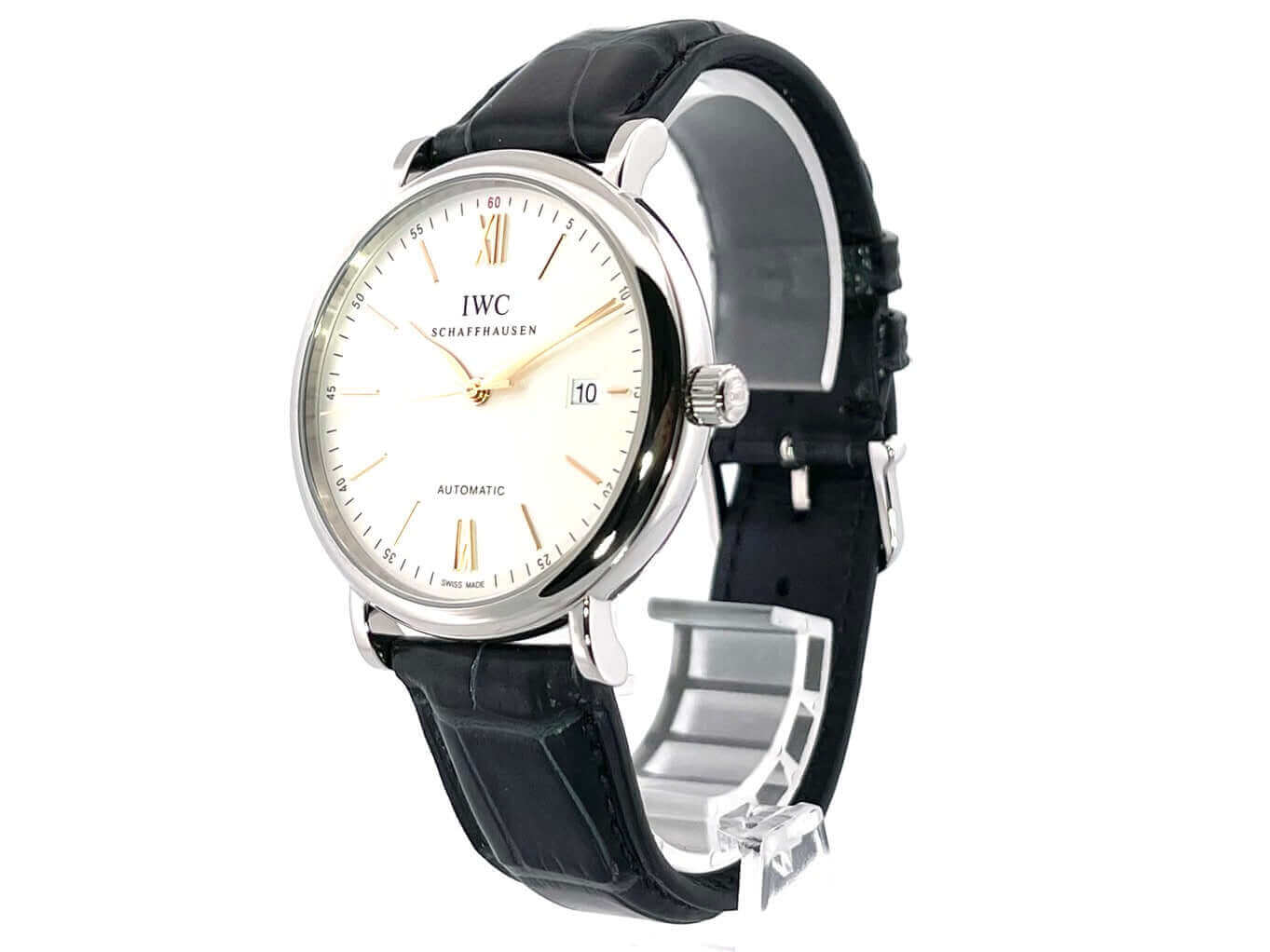 Gehäuse aus Edelstahl poliert, Gehäusedurchmesser 40 mm, Gehäusehöhe 9,5 mm, schwarzes Lederarmband mit Ziernaht und Dornschließe, Zifferblatt silberfarben mit aufgesetzten roségoldenen Indexen, roségoldene Zeiger, Automatikwerk, Kaliber IWC 35111, Schwingung 28.800 A/h, Gangreserve für 42 Stunden, Datum, kratzfestes Saphirglas, verschraubter Boden aus Edelstahl, Wasserdicht bis zu 3 bar.
