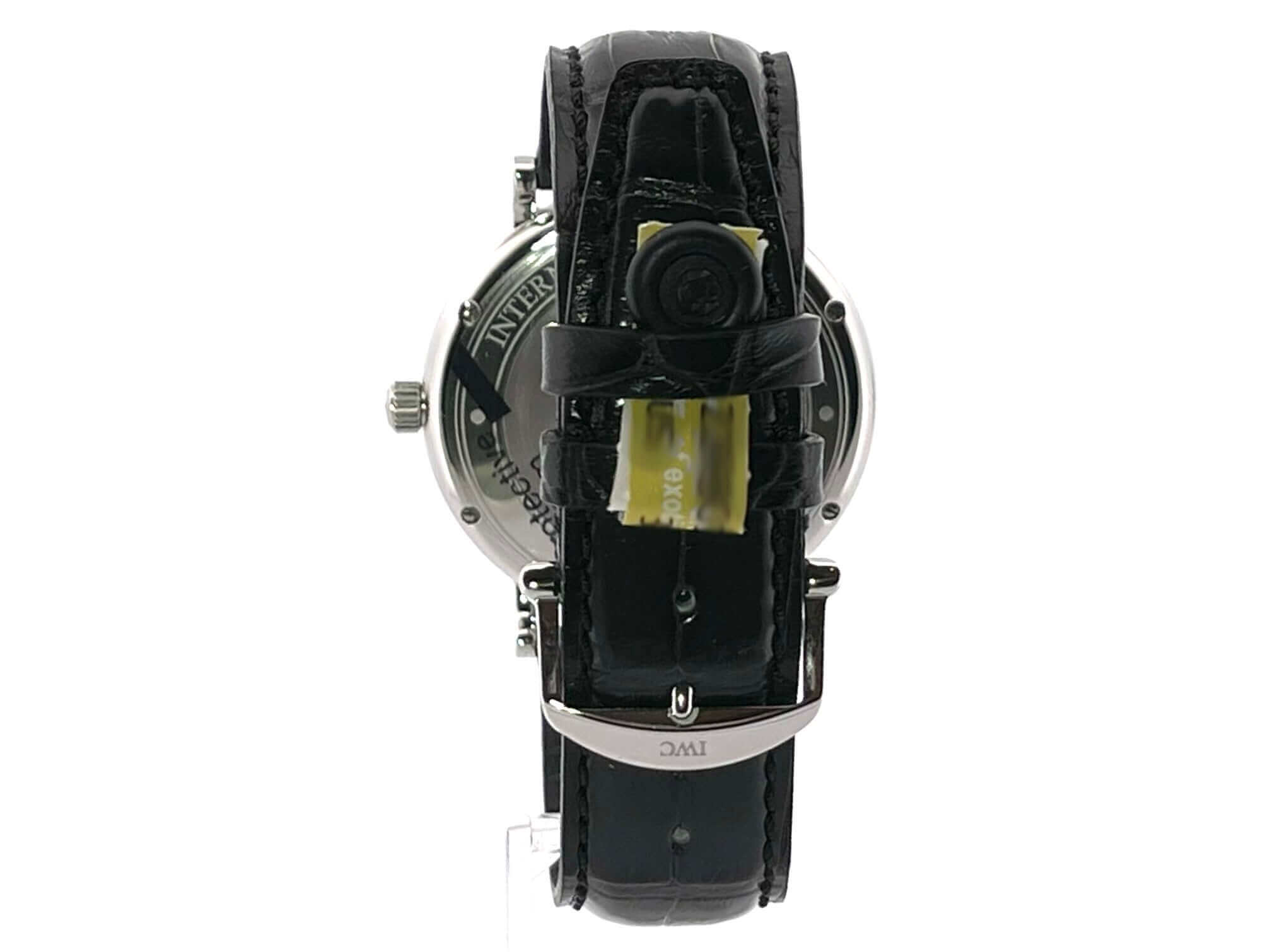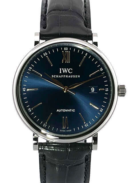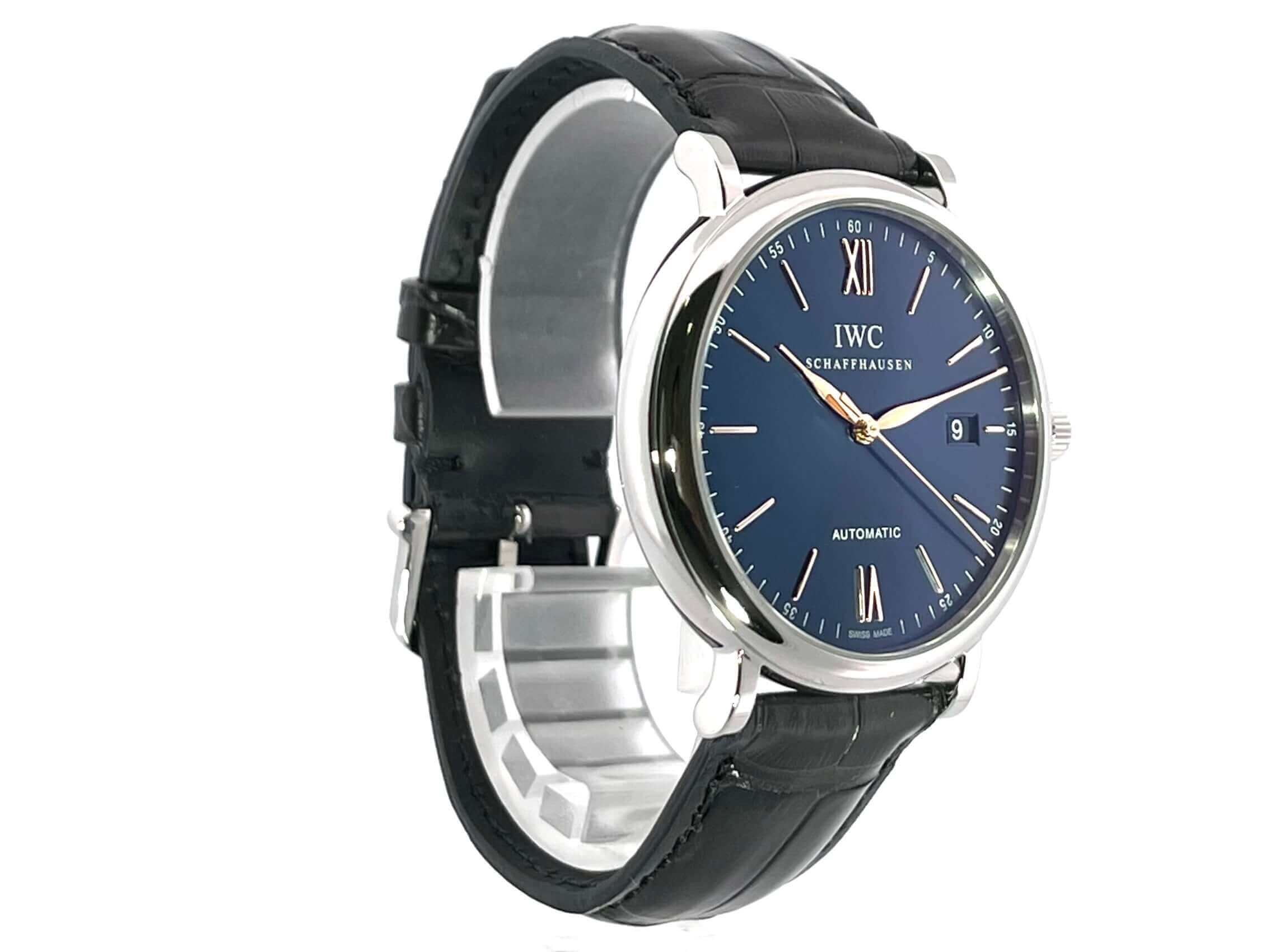 Gehäuse aus Edelstahl poliert, Gehäusedurchmesser 40 mm, Gehäusehöhe 9,5 mm, schwarzes Lederarmband mit Dornschließe, blaues Zifferblatt mit aufgesetzten Indizes, roségoldene Zeiger, Automatikwerk, Kaliber IWC 35111, Schwingung 28.800 A/h, Gangreserve für 42 Stunden, Datum, kratzfestes Saphirglas, verschraubter Boden aus Edelstahl, Wasserdicht bis zu 3 bar.