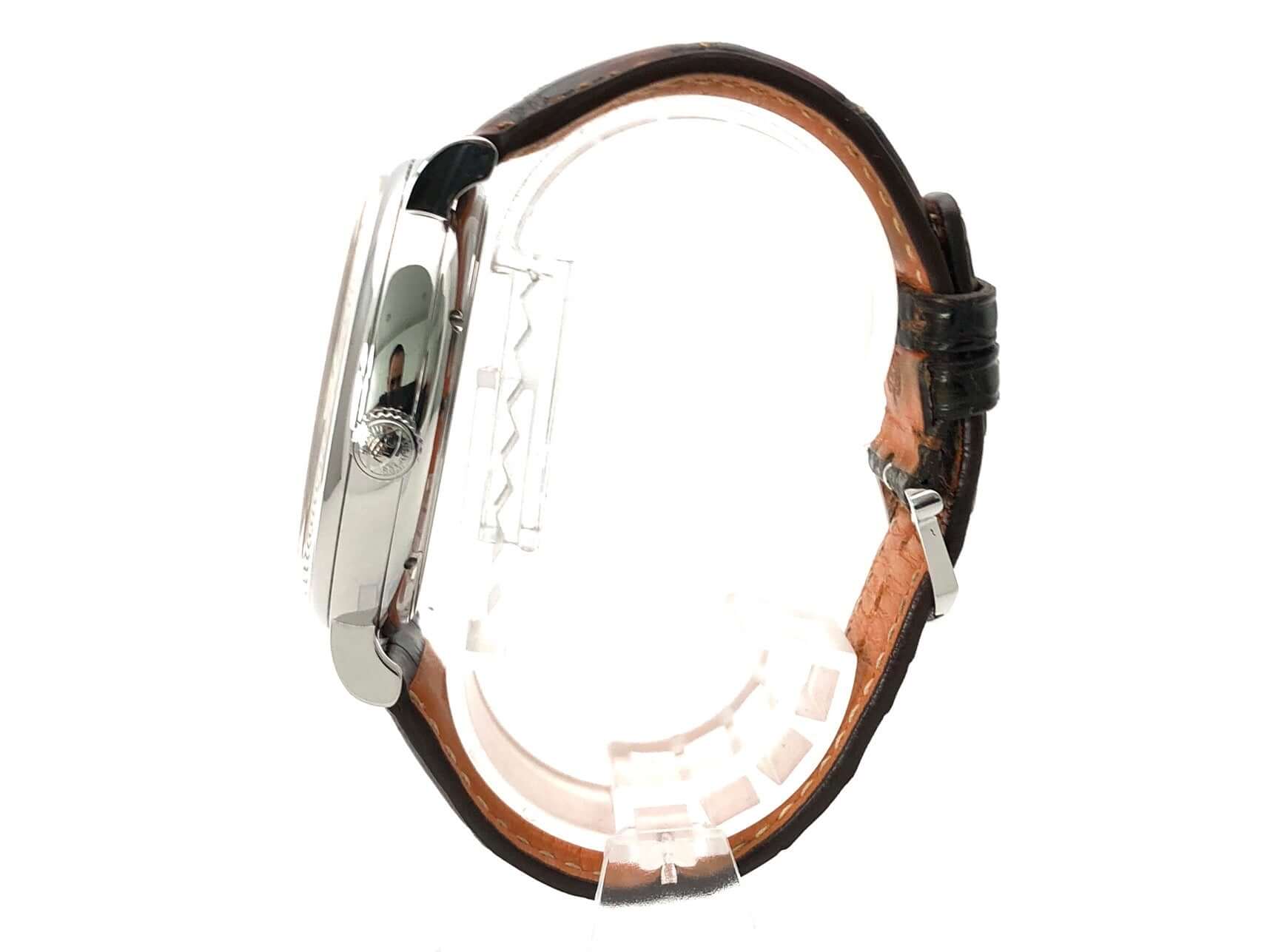 Gehäuse Edelstahl poliert, Durchmesser 45 mm, braunes Alligatorlederarmband von Santoni mit Dornschließe, silberfarbenes Zifferblatt mit Gangreserveanzeige, Datumsanzeige auf 3 Uhr Position und kleiner Sekunde, Mechanisches Uhrwerk mit Handaufzug, Manufakturkaliber 59210, 30 Steine, Breguet-Spirale, Gangreserve ca. 192 Stunden, Gangreserveanzeige, Datumsanzeige, kleine Sekunde mit Stoppvorrichtung, Saphirglas, beidseitig entspiegelt, Sichtboden mit Saphirglasfenster, Wasserdicht bis zu 3 bar.