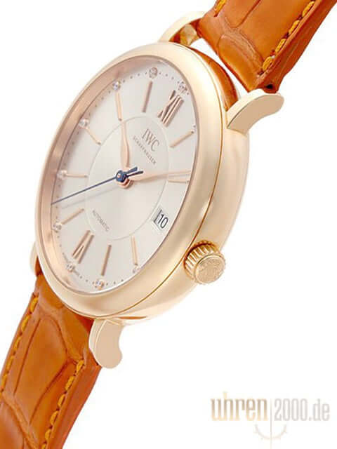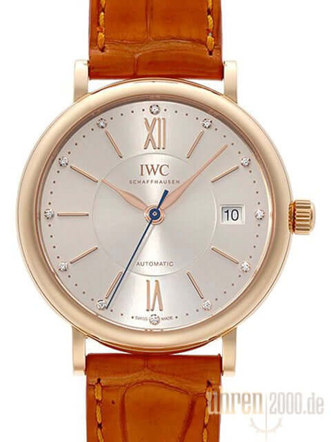 Gehäuse aus 18 kt Rotgold poliert, Gehäusedurchmesser 37 mm, Gehäusehöhe 9 mm, braunes Lederarmband mit 18 kt Rotgold Dornschließe, silberfarbenes Zifferblatt mit Sonnenschliff und 12 Diamanten, Rotgold Zeiger, Automatikwerk, Kaliber IWC 35111, Schwingung 28.800 A/h, Gangreserve für 42 Stunden, kratzfestes Saphirglas, Datum, verschraubter 18 kt Rotgold Boden, Wasserdicht bis zu 3 bar.